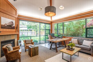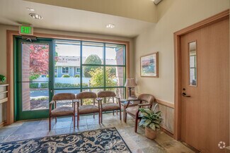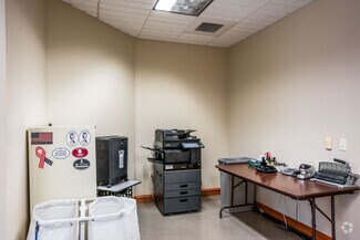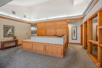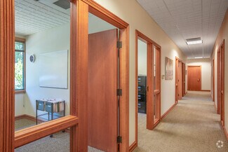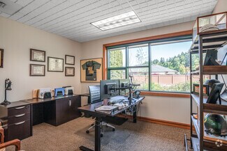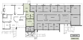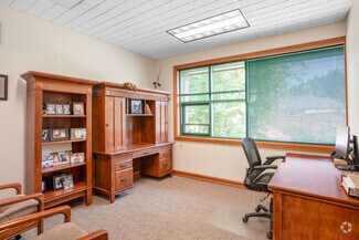 This Class A office building is demised into two professional office suites, each including multiple private offices, reception areas, and open work rooms. Suite 100 also includes an executive boardroom, and Suite 150 includes a private executive restroom. One of the private offices in each suite includes a gas fireplace. A 615 SF shared common area is located between the two suites, and includes a break room, two ADA restrooms and a mechanical/electrical room. The office is of wood-framed construction and has a decorative brick veneer on the exterior walls. The roof is gabled with a standing seam metal covering. The tenant suites are accessible via separate entrances located along the west elevation of the building. The entrances include double pedestrian doors that are glass encased in metal. The building was built by Dalke Construction and designed by AC&Co Architecture.