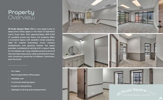 33 Music Square West offers a rare opportunity to lease prime office space in the heart of Nashville’s iconic Music Row. With approximately 1,700–3,400 SF available across two floors, this property offers a functional layout with excellent street presence. Ideal for creative businesses, music industry professionals, and growing brands, the space provides a professional setting with a layout ready for immediate use. Enjoy walkable access to some of the city’s best restaurants, cafes, and entertainment, with convenient proximity to Midtown, Downtown, and The Gulch.