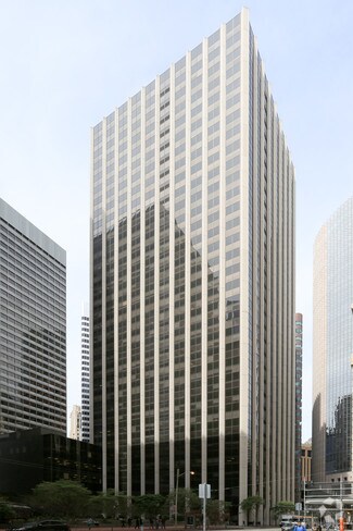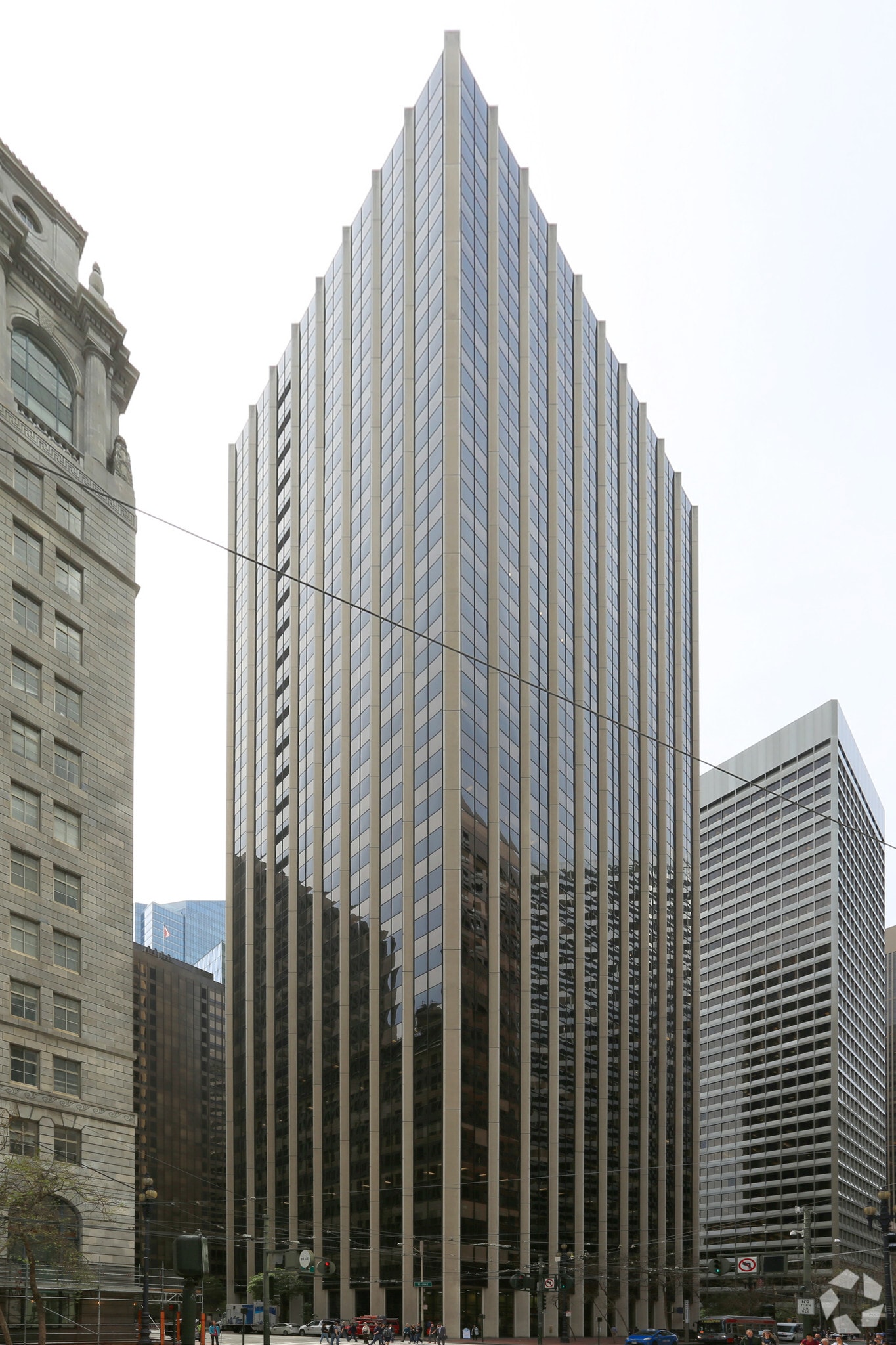 Developed by Shorenstein Company and designed by the award-winning Gin Wong in 1979, the white exterior facade features vertical, diamond-shaped precast concrete columns, solar bronze windows and anodized aluminum window mullions. The travertine marble lobby opens onto a landscaped garden plaza paved with rose granite.