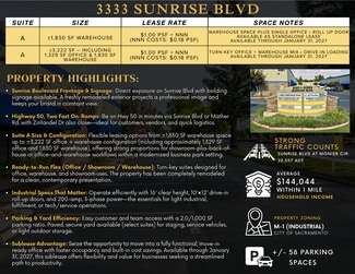 Sublease opportunity at 3333 Sunrise Blvd, Suite A in Rancho Cordova offering a clean, modern flex suite with direct Sunrise Boulevard frontage and signage potential. Two configurations are available: ±1,830 SF warehouse space with a private office, or the full ±3,222 SF mix featuring ±1,329 SF of turn-key office and ±1,830 SF of warehouse. The suite supports efficient operations with 16’ clear height, a 10’x12’ drive-in roll-up door, and 200-amp 3-phase power. Fast access to Highway 50 via nearby on-ramps makes the location functional for customers, vendors, and daily logistics. Sublease term runs through January 31, 2027 at $1.00 PSF + NNN (NNN: $0.18 PSF).