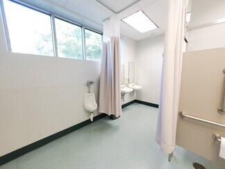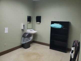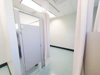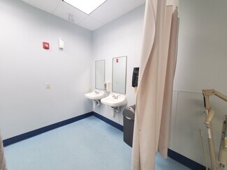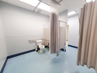 • Floor plan includes open areas, a conference room, restrooms, shower, nurse station, and private offices
