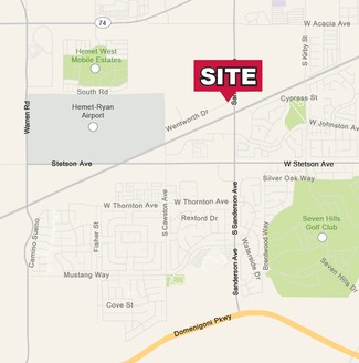 Rent is $2.25 PSF/Month + NNN (estimated $0.70 PSF/Month) - Call for details. Suites ranging from 973 s.f. to 2005 s.f. Approx. 180 parking spaces. Signalized corner. Traffic count: approx. 25,000 cars per day. Outstanding visibility in a newer section of Hemet. Near major developments: Lowe's, Home Depot, Wal-Mart/Walgreens. Located at the northwest corner of Sanderson Avenue & Wentworth Drive; accessible from both streets.