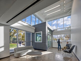 • Shared amenities include a two-story central atrium with seating, kitchen, meeting spaces, printing facilities, and shared laboratory equipment.
