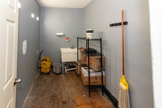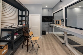 Secured under a 5-year lease (Nov 2025 – Oct 2030) with tenant responsible for utilities per lease terms. Features include a storefront with large glass display windows, laminate wood flooring in the lobby, and a flexible layout with retail area, storage room, open workspace, and mudroom. Kitchenette includes sink and refrigerator, plus a half bath.