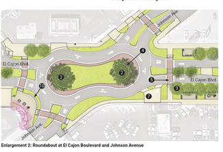 The middle section of El Cajon Blvd. (as it crosses through the city) has the potential to become a commercial “village” with a fine-grain, “Main Street” feeling and a highly walk-able environment. The key focus of land uses in this area is to encourage small-scale, fine-grain commercial with active sidewalks and engaging storefronts in the middle section of the boulevard, flanked on the ends by higher intensity commercial, mixed-use developments with an active ground floor. By reclaiming a portion of the right-of-way, the street can be reconfigured with wide sidewalks, plazas, and sidewalk cafes to complement active commercial uses. In addition, new developments are encouraged to provide public spaces on the street to help enliven the street experience