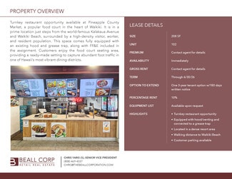 Turnkey restaurant opportunity available at Pineapple County Market, a popular food court in the heart of Waikiki. It is in a prime location just steps from the world-famous Kalakaua Avenue and Waikiki Beach, surrounded by a high-density visitor, worker, and resident population. This space comes fully equipped with an existing hood and grease trap, along with FF&E included in the assignment. Customers enjoy the food court seating area, providing a ready-made setting to capture abundant foot traffic in one of Hawaii’s most vibrant dining districts.