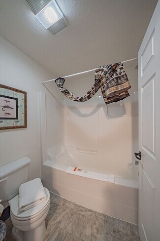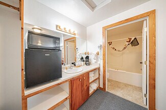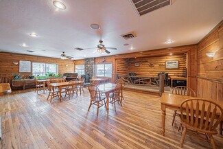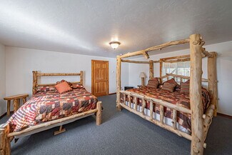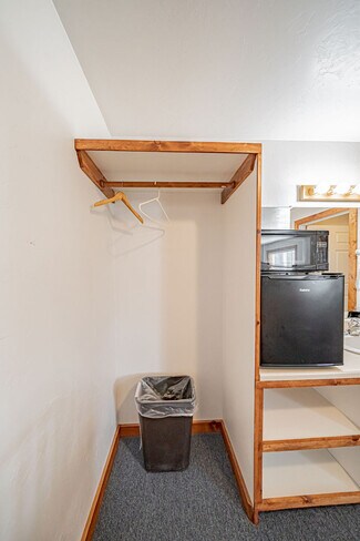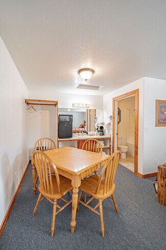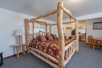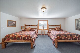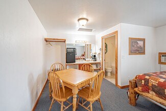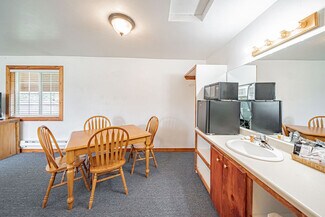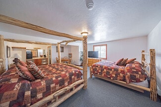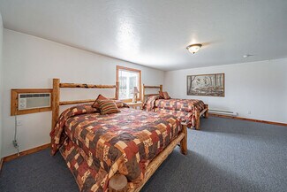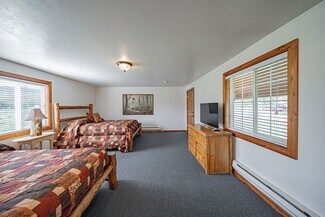 The large parking lot allows for easy maneuvering of RVs and snowmobile trailers. The lodge features 7 well-appointed rooms with single or double queen beds. Additionally, a two-bedroom, one-bath house serves as the manager's quarters, and several RV hookups are available for rental during the summer season.