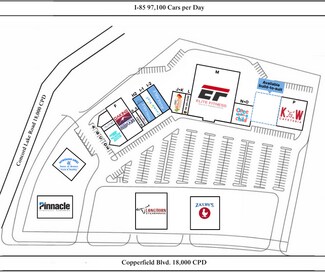 - Prime Location: 74,440 SF center at Copperfield Blvd & Branchview Rd, just 1/3 mile from Carolinas Medical Center Northeast and 1/2 mile from Carolina Mall. - Strong Tenants: Anchored by K&W Cafeteria and Elite Fitness, other tenants include The UPS Store, CosmoProf, and Once Upon a Child. - Recent Upgrades: New LED lighting, refurbished pylon signage, fresh exterior repaint, and parking lot improvements. - High Traffic & Visibility: 964’ frontage, and strong visibility from I-85, with several dining outparcels including Zaxby’s, Longhorn Steakhouse, and Mykonos Grill.