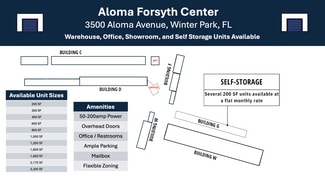 Orlando Industrial Real Estate is pleased to present Aloma Forsyth Center, a ±90,000 SF multi-tenant business park in Winter Park along the highly coveted Aloma corridor. This property offers warehouse, office, showroom, and self- storage space for lease, with suites from 200 SF to 3,200 SF. Flexible zoning allows tenants to operate and license their business on-site. Features include ample parking, overhead grade doors, restrooms, and mailbox access.