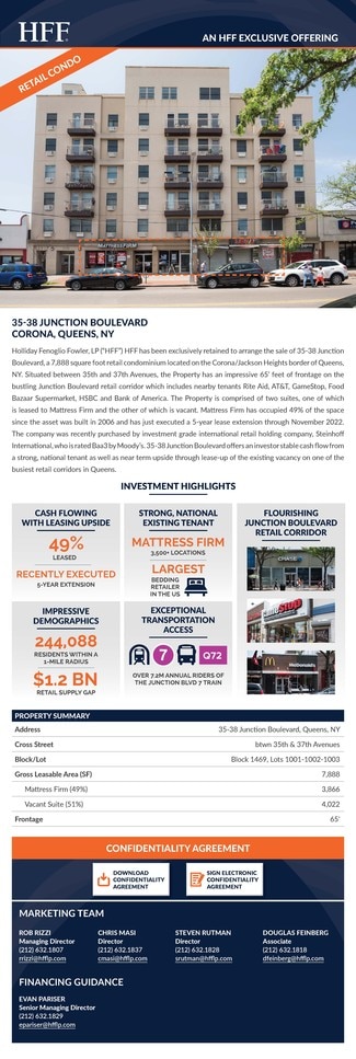 The subject offering is an 8,100-square-foot, three-unit ground floor retail condo located at the base of an 83-unit, seven-story condominium building on Junction Boulevard in Corona (Queens). The property has 65 feet of contiguous retail frontage on Junction Blvd, one of the best and most heavily traveled retail corridors in all of Queens. The property is 100 percent occupied with three tenants. All three tenants have long-term leases, three percent annual increases and they all reimburse for their proportionate shares of real estate taxes. The offering consists of three separate tax lots, and three separate condo units. The property is located just two blocks from the Junction Blvd Subway Station (7 Train) on the corner of Junction Blvd and Roosevelt Avenue, a street lined with national retail tenants.