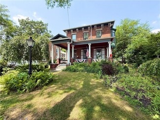 Welcome to this stately brick Victorian established as a charming and successful Bed & Breakfast in the heart of the Finger Lakes, located in the historic "Birthplace of Memorial Day." This turnkey property offers five beautifully decorated ensuite guest bedrooms, plus a private owner's suite conveniently located on the first floor. A wide, open front porch sets the tone for relaxation and leisure, perfect for enjoying your favorite drink while taking in the village atmosphere. Inside, you're greeted by a grand foyer with a magnificent staircase, leading through elegant French doors to a formal living room, a spacious entertainment room complete with a pool table, and a spacious formal dining room ideal for guest breakfasts or special events. The fully applianced kitchen features a striking black and white tiled floor, with entrance out to side yard and full basement providing added functionality. A private rear entrance and parking area ensure convenience for both owners and guests. Throughout the home, there are plenty of inviting nooks for peaceful retreats, as well as open gathering spaces that encourage connection and comfort. Included in the sale is a former carriage house, now used for storage, with exciting potential for future conversion into additional living quarters or income-producing accommodations. Just steps from the Cayuga-Seneca Canal, downtown shopping, local banks, and Memorial Day Park, this lucrative business opportunity blends timeless elegance with small-town charm in one of the Finger Lakes' most beloved communities. Please see list of improvements attached. Such an impressive B&B and home that offers so much opportunity, rather a single family home or a continued business.