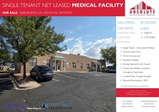 Absolute Investment Realty has been selected as the exclusive representative for the NNN sale-leaseback of this attractive medical office building located in the heart of Santa Fe. This property is convenient to I-25 and near Santa Fe’s 2 largest hospitals (Christos St. Vincent Regional Medical Center, Presbyterian Santa Fe Medical Center). This asset is an opportunity to own real estate in the prestigious and high-barrier to entry market of Santa Fe, NM. New Lease Effective with Allevio Care, a nationwide. See Investment Summary and About the Tenant for more information.