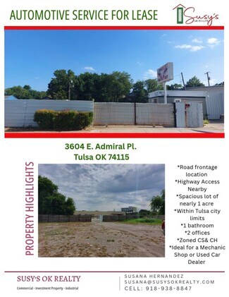Located at 3604 E Admiral Place in Tulsa, this automotive service property offers an opportunity for businesses seeking visibility and functionality in a high-traffic corridor. The site features nearly one acre of land within Tulsa city limits, providing ample space for operations and customer parking. With direct road frontage and convenient highway access nearby, the property ensures excellent connectivity for both local and regional traffic. The building includes a front-facing office, a spacious central area, and a two-bay shop at the rear, making it ideal for automotive services, a mechanic shop, parking space, or a used car dealership. Zoned CS and CH, the property offers flexibility for a range of commercial uses. This location combines strategic positioning with practical amenities, creating an attractive option for operators looking to establish or expand their presence in Tulsa’s thriving market.