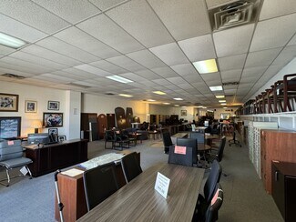 The available space is roughly 31' wide x 230' long. There is a dock-high roll up door in the rear with ceiling height ranging from 10' - 11'7". The space includes warehouse area, large showroom, 4 offices, and 2 bathrooms. The front half is retail-showroom, the back half is warehouse. There is ample parking with nice large pylon signage available.