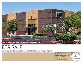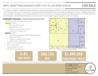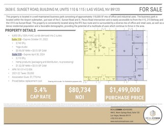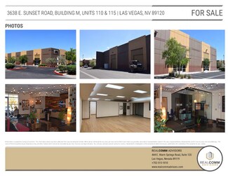 This property is located in a well-maintained business park consisting of approximately 118,000 SF mix of office and industrial uses. The business park is located within the Airport submarket, just east of the E. Sunset Road and S. Pecos Road intersection and is easily accessible to/from the I-15, 215 Beltway and the I-515 via Sunset Road. The property is conveniently located along the RTC bus route and is surrounded by a diverse mix of office and retail uses, as well as a dense residential population and a favorable demographic, providing the potential of a multitude of uses which continue to thrive in the area.