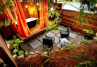 • outdoor bathtubs and a communal gathering patio with gas fireplace