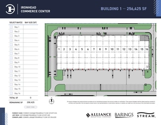 RBA: 256,425 Divisible: 128,213 Building Dimensions: 310' x 830' DH Doors: (45) 9'X 10' OH Doors Oversized Doors: (2) 12X14 OH Doors W/ Ramps Column Spacing: 54' W x 50' D Speed Bay: 60' Clear Height: 36' Car Parks: 199 Trailer Parks: 58 Truck Court Depth: 185' Building Configuration: Rear Load Office: BTS Slab: 7" Roof & Insulation: 45 MIL - R9 Security: Ability to Fully Secure with Fence Sprinkler: ESFR Power: 1,000 kVA transformer w/ 2,500 amp tap can