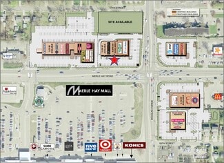 Located at The Shops of Merle Hay, this 4,690 SF former Mattress Firm is part of the successful retail center at one of the busiest intersections in Des Moines. Join Dunkin', Sun Tan City, Wing Stop and US Cellular at the entrance to Merle Hay Mall, Target, Kohls and Starbucks. Plenty of parking available. Visible to over 60,000 cars per day. Can be divided to 1,845 SF.