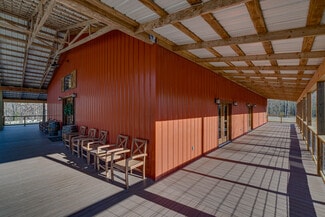 Outside, guests are welcomed by a beautiful wooded ceremony area with benches already in place, creating a peaceful and private backdrop for events. The building is enhanced by long covered porches along the front and both sides, spanning the full length of the venue and offering generous space for guests to gather, mingle, and enjoy the setting. The property also provides ample on-site parking, easily accommodating large gatherings and event traffic.