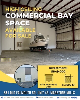 Introducing a prime investment opportunity in Marstons Mills, MA – Large Bay Space situated at 381 Old Falmouth Rd., Unit 43. This high bay commercial condo boasts approximately 3,600 sq. ft. of versatile space, featuring a 14’ overhead door, 20+’ interior clearance, and plumbing ready for restroom installation.