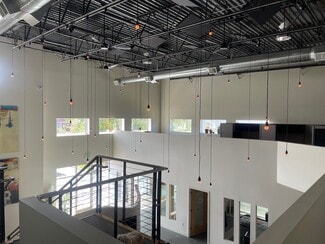 This modern, flexible office/retail/industrial space is fully built out as an audio/visual production studio with a 2 story green screen and sound studio. Would make an excellent showroom with warehouse. This end unit has plenty of light and an open floor plan with a large mezzanine level, 3 bathrooms, a modern kitchen, plenty of storage, conference room and 9 private offices. In the rear are 2 exterior docks with space for 3 roll-up doors and reserved parking spaces.