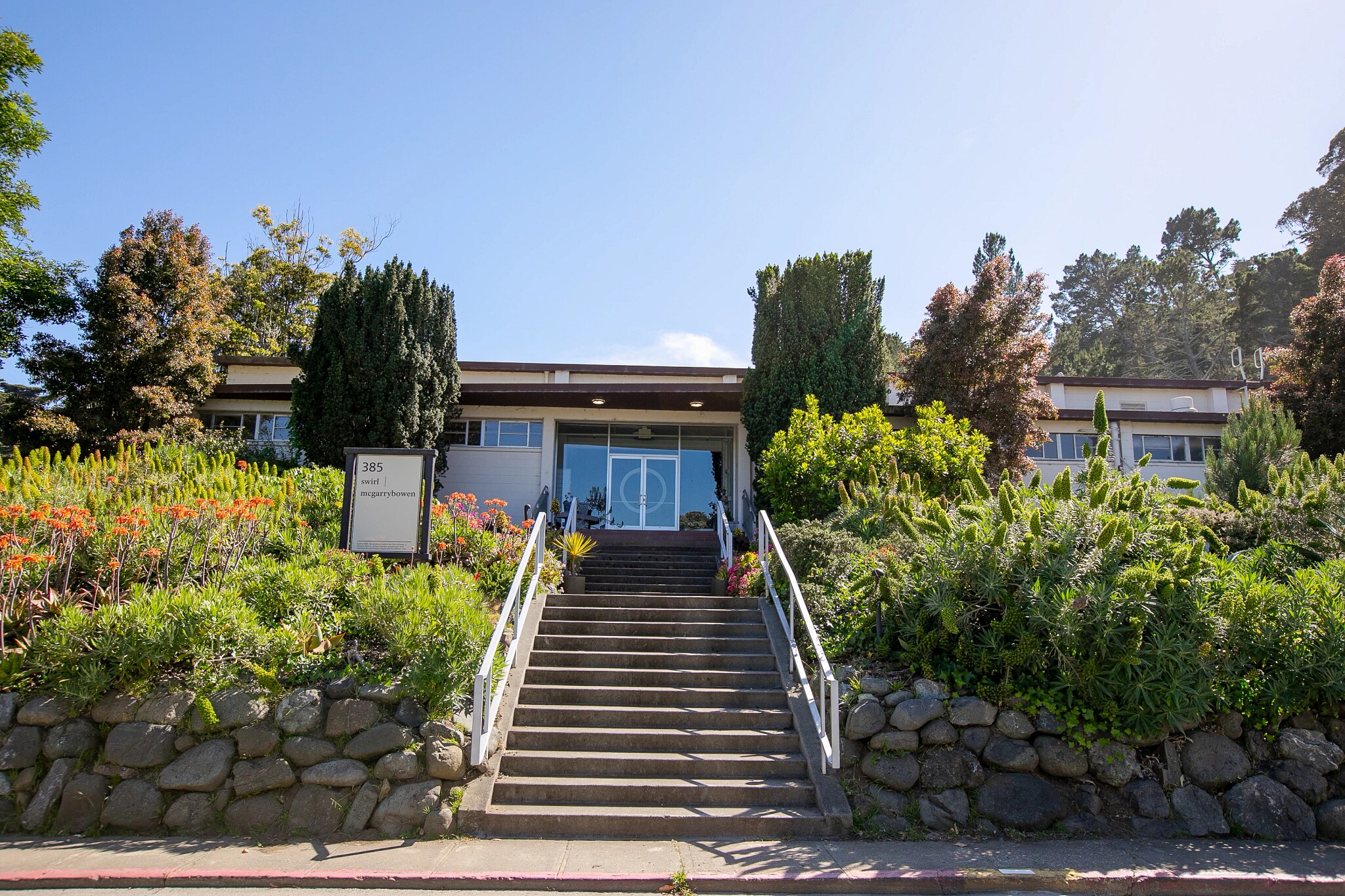 Stand-alone, single-tenant building in the Presidio’s Main Post neighborhood. This unique, clear span, high ceiling space is offered for office, child care, cultural, educational, health and fitness, or recreational uses Concrete ceilings, floor to ceiling storefront window that amplifies natural light