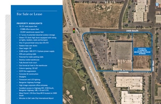 For Sale or Lease – 70,131 Industrial Building with ±2.7 Acres IOS 3865 W 2400 S, West Valley City, UT Located along Bangerter Highway, this 70,131 SF facility features 27,089 SF of office, 43,042 SF of warehouse with 26’ clear height, 11 dock doors, 1 ramp door, ESFR, and 2,500 amps of power. The site includes ±2.5 acres of industrial outdoor storage, 229 auto stalls, trailer parking potential, and excellent access to I-15, I-80, I-215, and SLC International Airport. Ideal for logistics, distribution, or corporate operations.