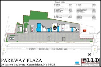 Parkway Plaza is strategically located at the north end of Canandaigua Lake, just south of the NYS Thruway (I-90), Exit 43, between Syracuse and Rochester in the Finger Lakes Region. The Eastern Blvd area is a busy retail corridor, including strip malls, restaurants, and major retailers including Wal-Mart, Lowes, and a Wegmans Superstore, Canandaigua is the western gateway to the Finger Lakes, and boasts world-renowned wineries, and historic sites, such as the magnificent Sonnenberg Gardens and NY State Wine and Culinary Center.