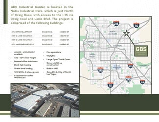 GBS Industrial Center is located in the Nellis Industrial Park which is just North of Craig Road with access to the I-15 via Craig road and Lamb Blvd. The ±222,950 SF project consists of four (4) multi-tenant industrial buildings featuring dock-hi and grade-level truck loading, 120/208v, 3-phase power, 22' - 24' Clear Height, Zoned M-2 and fully fire-sprinklered.