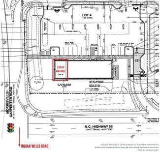 1,318 SF cold dark shell condition. TI Allowance for prospects with strong financials $29.00/ SF NNN; $5.50 TICAM (Landlord reserves the right to convert to Gross Lease) The site is highly visible from the signalized intersection of NC HWY 55 (28,000 AADT) and Indian Wells Road (13,000 AADT) NC HWY 55 is a major commuting route to the more than 60,000 employee RTP community from the bedroom communities of Cary (one of the fastest growing towns in the county), Apex and points south Located one mile from the 2,324 student Green Hope High School Right-in only access from the going-to-work side of NC 55 Right-in and Left/Right-out access to the signalized Morrisville Carpenter Road (Indian Wells Road) No vape or hemp tenants permitted Limited parking available