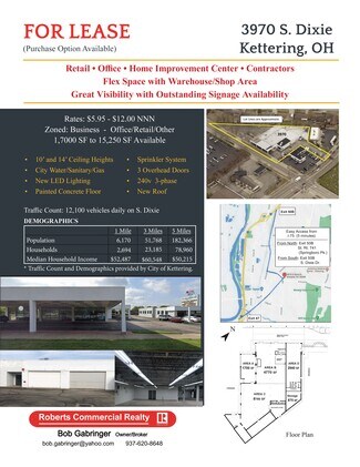 Uses include office, retail, contractor's office/shop and home improvement sales/services/showrooms. ALL spaces can be combined for any use up to 13,550sf for as low as $6.95/SF. Great visibility with frontage on S. Dixie Dr. 12,300 cars/day. Majority of the building has 10' ceilings with approx. 1,300sf of 14' ceilings. Fully sprinklered. RTA stop 2 blocks away. Landlord will provide "vanilla box" with LED lighting. Size and configuration of space can be slightly modified. Lease with an option to purchase can be discussed.