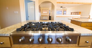 Inside, the open-concept main level features a welcoming entry, spacious living and dining areas, and a kitchen perfect for gatherings. The kitchen boasts ample cabinetry, granite counters, a large island with a peninsula, dual cooktops (gas and electric), double ovens, and a generous pantry—ideal for everyday use and entertaining. A sunroom on the northwest side offers sweeping views of cliffs and nighttime skies.