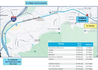 Located on the well-traveled thoroughfare San Pablo Dam Rd surrounded by other local businesses, single-family homes and low-density housing. Multiple Highway 80 access points nearby allowing for a short commute to Pinole, Hercules, San Pablo, and Richmond.
