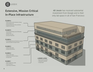 40 Jessie is the only fully equipped, modern lab facility in downtown San Francisco, offering immediate proximity to Salesforce Park, Market Street, BART, and the Transbay Transit Center. With its irreplaceable location, specialty infrastructure, and corporate tenancy, the property stands as a unique urban R&D outpost combining premier functionality, connectivity, and long-term stability.
