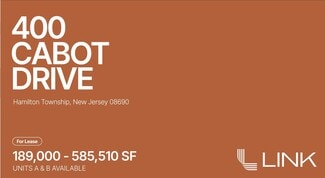400 Cabot Drive in Hamilton, New Jersey, presents a premier leasing opportunity within a 585,510-square-foot industrial facility designed for high-performance logistics and distribution. The divisible space offers flexible options of 189,000 square feet and 396,510 square feet to accommodate a range of operational needs. Located in the Exit 7A Distribution Center, 400 Cabot Drive features 24-foot clear heights, 40-foot by 50-foot column spacing, 96 tailboard doors, five drive-in doors, and a 140-foot truck court for efficient freight handling. Additional highlights include 14,665 square feet of office space, a fenced and secured trailer drop lot, and parking for 141 cars and 66 trailers, making this a highly functional, scalable, and secure industrial solution.