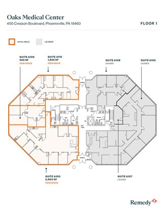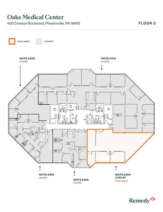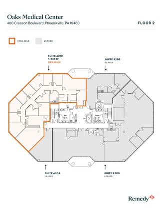 Oaks Medical Center at 400 & 450 Cresson Boulevard offers highly visible, Class A medical office space outside Philadelphia. This two-building, 72,300-square-foot center boasts a window-wrapped façade allowing abundant natural lighting. A variety of office spaces with move-in ready options and full medical build-outs are available to best fit business needs. Enjoy ample surface-level parking and prominent signage opportunities along the heavily trafficked Route 422. Nearby amenities include Starbucks, Buffalo Wild Wings, Jersey Mike's Subs, Oaks Nail Spa, Supercuts, Dunkin', UNO Pizzeria & Grill, Wendy's, and more. The King of Prussia Mall and Providence Town Center are less than 15 minutes from the property.