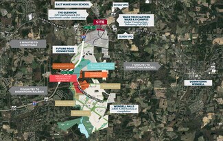 Retail outparcels for sale or lease ranging from 1.15 to 5.55 acres. The 257-acre mixed use development allows up to 650 multifamily units and additional single family and townhomes. Traffic counts in excess of 62,000 VPD on I-87 and 22,500 VPD on US 64 Bus (Wendell Boulevard). Multifamily planned directly adjacent to outparcel sites. Close to East Wake High School and the new Wake Tech Eastern Wake 4.0 campus, a 106-acre campus with programs in engineering, biopharmaceutical technology, robotics, and intelligent automation.