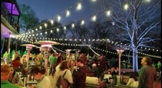 • Creek front beer garden with exterior lighting and seating spilling from the restaurant’s interior