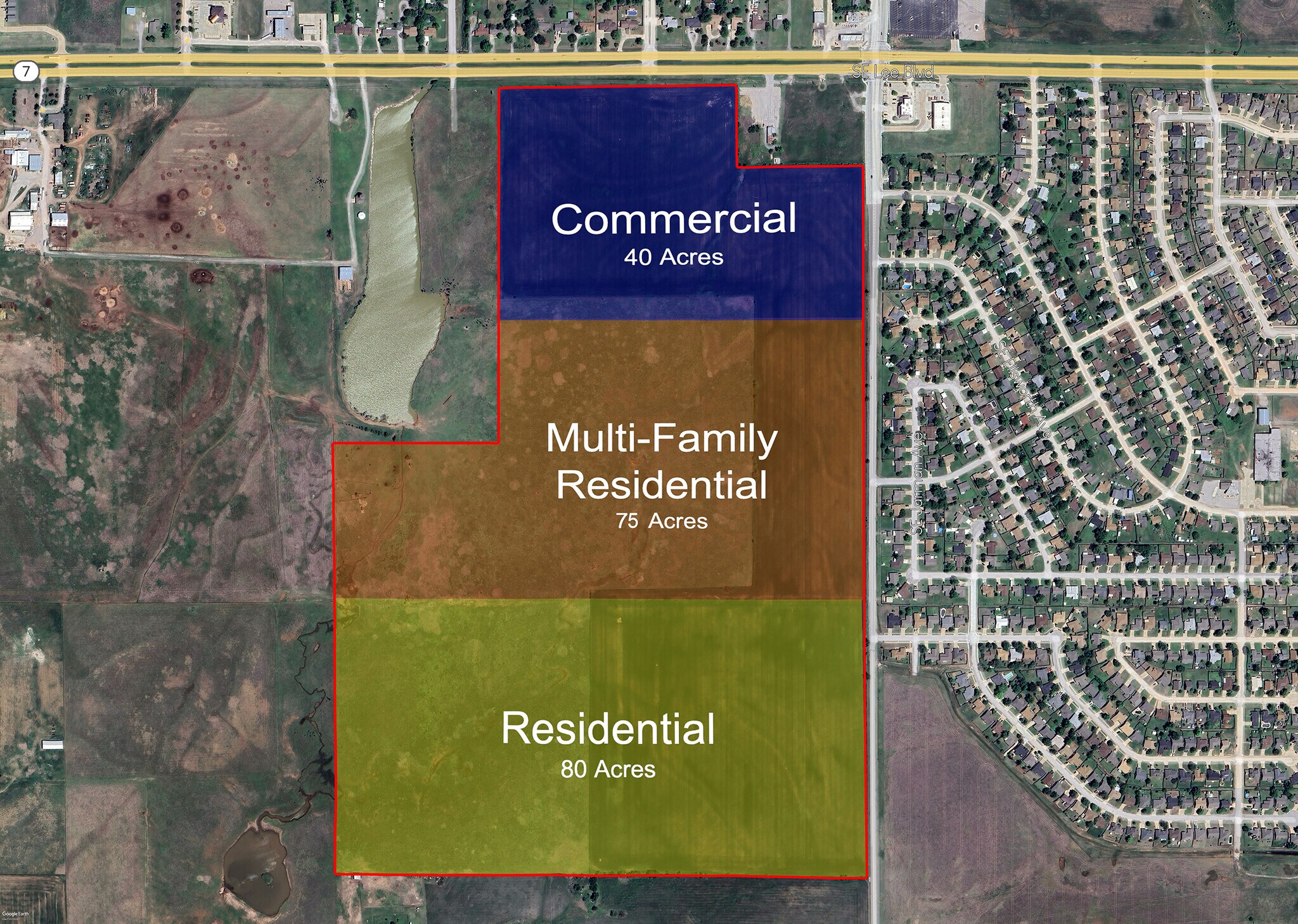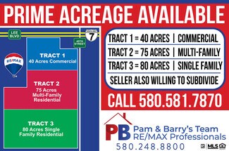 Tract 1: Excellently located 40 acres that are primed for commercial development. Featuring frontage to the heavy traffic flow of both Lee Blvd and State Hwy 7. State Hwy 7 sees heavy traffic counts and a wide range of traffic including trucking and personal. Located on the east side of Lawton near several large established residential areas. Includes 40 commercial acres that can be built to suit a wide variety of commercial developments. Lawton is an excellent location and is experiencing economic growth, making it ideal for commercial investment. Contact Listing Broker Pam Marion for more details — 580-580-7870. Tract 2: Fantastic location for multi-family housing located on Lawton's East side. It is minutes from Fort Sill and a direct drive to Goodyear. It is also situated within short driving distance of a variety of entertainment and dining options, but out of the main heart of the city. Featuring frontage to the heavy traffic flow of both Lee Blvd and State Hwy 7. State Hwy 7 sees heavy traffic counts and a wide range of traffic including trucking and personal. Lawton is seeing economic growth in multiple sectors and features the large US Army post Fort Sill. Due to these factors, the rental market is strong and remains so year-round. Lawton is an excellent location and is experiencing vast economic growth. Contact Listing Broker Pam Marion for more details — 580-580-7870. Tract 3: Ideal location that is primed for residential development. It is situated within short driving distance of a variety of entertainment and dining options, but out of the main heart of the city. Includes 80 residential acres that can be built to suit a variety of residential housing plans. Located on the east side of Lawton near two large established residential areas. Just a couple minutes from a grocery store, gas station, and excellent schools. Lawton is seeing economic growth in multiple sectors and features the large US Army post Fort Sill. Due to these factors, the housing market is strong. Contact Listing Broker Pam Marion for more details — 580-580-7870.