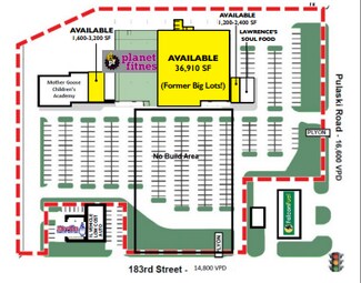 Join Planet Fitness at the NWC of 183rd St & Pulaski Road. Property is located at a busy intersection with full access from both major streets. Nearby retailers include Walgreens, Dollar General, Aldi, Dunkin, Advance Auto Parts, Wendy’s. Former Big Lots! space has a brand new storefront, HVAC units, restrooms, lighting and loading docks. Additional small shop space available with potential to build additional square footage.