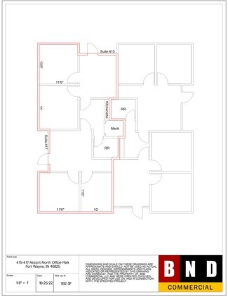 Office condo for lease. Located in Airport North Office Park on southeast corner of Cook Road & Lima Road. Unit 415 - 495 SF; Unit 417 - 495 SF; Units may be combined for 990 SF. Easy to find within the office park, plenty of front door parking available. FOR MORE INFORMATION ON THIS, AND ALL BND PROPERTIES, PLEASE VISIT OUR WEBSITE AT www.bndcommercial.com/listings.