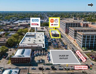 Hard corner outlot retail positioned directly on busy Diversey Avenue in Logan Square. Inline unit available facing both Diversey Ave and Ross/Petco. Outlot parcel at Diversey/Pulaski intersection also available for Ground Lease. Frontage and monument signage directly on Diversey Ave. Rare large parking lot for the area. Located across from Cermak Fresh Market on high-traffic, urban business corridor. 4 blocks to MD-N Metra line. 1 mile to I-90 access. High-income area densely surrounded by residential neighborhoods.