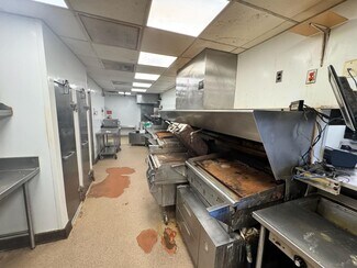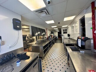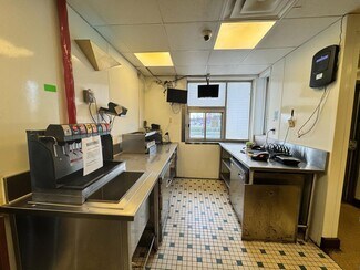 The subject has a well-designed layout with a broad range of commercial kitchen equipment, including ovens, flyers, flat top grills/ presses, stainless steel prep stations, fountain drink dispensary, a high-pressure cleaning station, grease transfer systems, and full ventilation cooking stations.