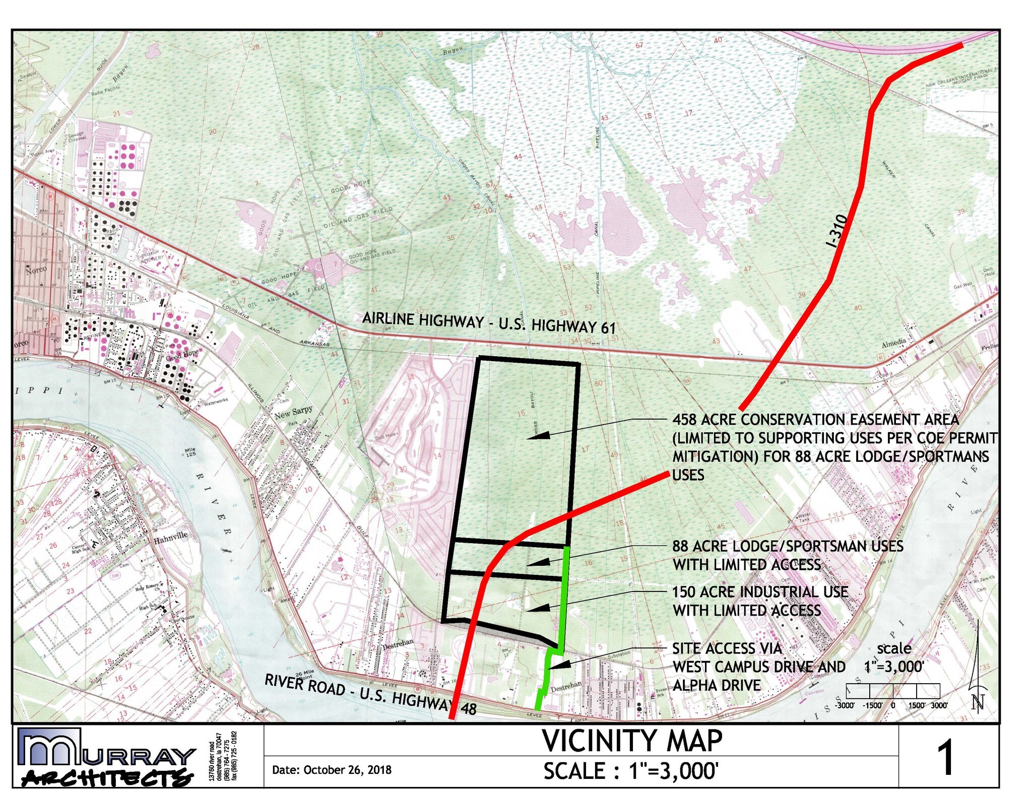 238 Acres of land for industrial use. Site access via West Campus drive and Alpha Drive & S Destrehan Ave. See attached map for more information. Located on the east bank of St. Charles Parish in close proximity to the Interstate 310 and a short distance from the New Orleans International Airport. The property is adjacent to the historic Destrehan Plantation Manor, the St. Charles Parish east bank regional library and a new $15 million 60,000 square foot St. Charles Parish Hospital complex. Property is Located ½ mile from I-310 with approximate drive times of 30 minutes to New Orleans, 1 hour to Baton Rouge, 50 minutes to Hammond.