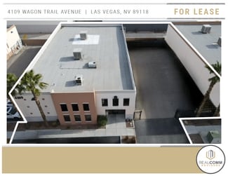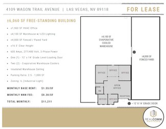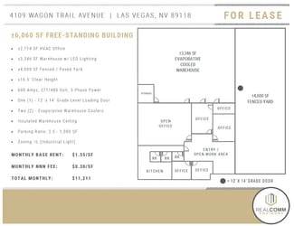 $1.55/sf + $0.30/sf NNN Fee totaling $11,211 monthly. 4109 Wagon Trail Avenue is a 6,060 SF free-standing industrial building including a 4,000 SF fenced & paved secured yard area; 2,714 SF of HVAC office space featuring an entry / open work area, five (5) private offices, kitchen, open office area, and three (3) restrooms; with the balance evaporative cooled warehouse serviced by (1) one 12' x 14' grade level loading door, LED lighting, 16.5' clear height, two (2) evaporative coolers, 600 amps, 277/480 volt, 3-phase power, insulated warehouse ceiling, and has a parking ratio of 2.5 per 1,000 SF. See attached brochure for more information. This free-standing building is situated in the southwest just south of W. Sunset Road and west of S. Valley View Boulevard and is minutes from The Las Vegas Strip and Harry Reid International Airport.