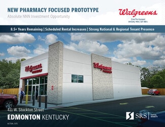 SRS National Net Lease is pleased to offer the opportunity to acquire the fee simple interest (land & building ownership) in an absolute NNN, newly built, drive-thru equipped Walgreens investment property located in Edmonton, KY. The tenant, Walgreen Co., has 8.5+ years of firm term remaining with an additional 4 (5-year) option periods left to extend. The lease features rare 5% rental increases every 5 years throughout the initial term and options, growing NOI and hedging against inflation. The lease is signed by the corporate entity (S&P: BBB-) and is absolute NNN with zero landlord responsibilities, making it an ideal, low-management investment opportunity for a passive investor. The offering presents the opportunity to purchase one of Walgreens’ brand new “Cooper” prototype pharmacies, a store that will have a health and wellness focus on the location’s front end.