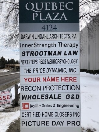 Quebec is a Professional Office building located in New Hope. Great access to Highway 169 and Highway 100. High visibility. Owner managed. 24 hr building Access. The build is within walking distance to YMCA, PUB 42 Bar & Restaurant, Lifetime Fitness, Caribou Coffee, Dunkin' Donuts, Country Kitchen, Subway and Applebees.