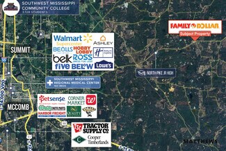 The Kase Group is pleased to offer the opportunity to acquire a newly leased Family Dollar property located at 4135 Mississippi 44 in Summit, Mississippi. This 10,500 square foot, single-tenant retail property is leased on a 10-year net lease (NN), offering minimal landlord obligations. The lease is backed by a corporate guarantee from Family Dollar. Strategically situated on Highway 44, the property benefits from excellent visibility and easy access to surrounding areas, enhancing its appeal to both consumers and investors. Summit, Mississippi is an established retail hub, and the Family Dollar store contributes to the growing demand for convenient, affordable retail options. The lease includes five 5-year renewal options, with $0.50/SF rent increases in each renewal period. The surrounding commercial environment features essential retailers such as the adjacent Piggly Wiggly and 4 Way Quick Stop. Traffic is further driven by major regional anchors, including Southwest Mississippi Community College and the 160-bed Southwest Mississippi Regional Medical Center, which draw significant daytime visitors. The property serves a tight-knit community within the broader Pike County trade area of approximately 40,000 residents, benefiting from a stable consumer base anchored by the local industrial and healthcare sectors.