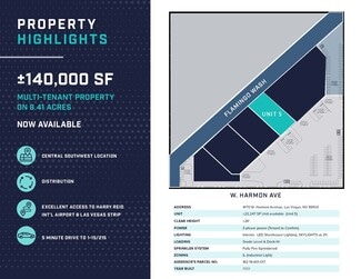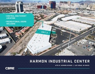 Harmon Industrial Center is an approximate 140,000 SF multi-tenant office/warehouse complex located at W. Harmon Avenue just west of Valley View Blvd. This centrally located property boasts exceptional connectivity to key locations, including the Harmon Interchange, I-215 and I-15 freeway interchanges, the Las Vegas Strip, and Harry Reid International Airport. There is an abundance of amenities via the Tropicana and Flamingo Interchanges.