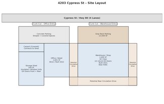Now Leasing – Rare Mixed-Use on Cypress St/Hwy 80. This ±4,545 SF mixed-use commercial property combines professionaloffice/retail, fully climate-controlled warehouse, and storage in one versatile, high-visibility location—ideal for tenants seeking a functional, move-in-ready space with daily exposure on one of the area’s busiest corridors. Includes additional ±1,601 SF of unfinished attic storage above the main office for files, inventory, or equipment.